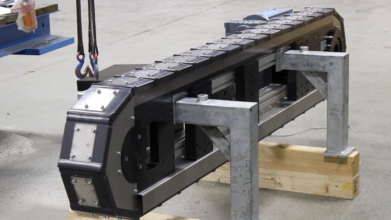 Precision link conveyors are usually designed for linear transfer, but can be manufactured to custom shapes. Customization can also include drive unit customization, pitches and strokes, hole tap sizes and configurations, mounting plates and chassis mounting options for accessories such as instrumentation or fixtures. Linear transfer systems can be customized to protect wearing parts from liquid or solid ingress or to cover pinch points for worker safety.